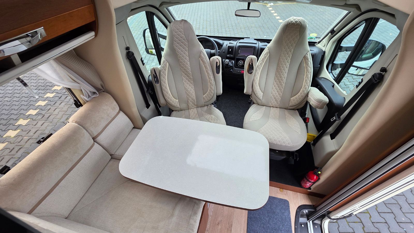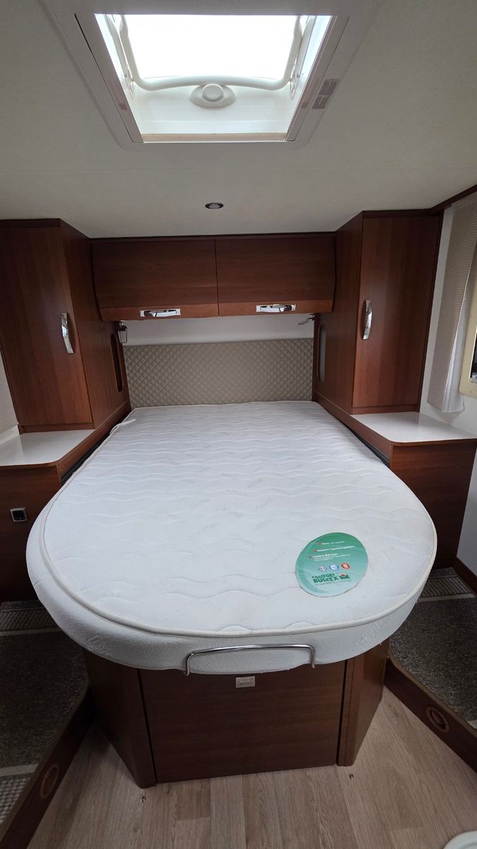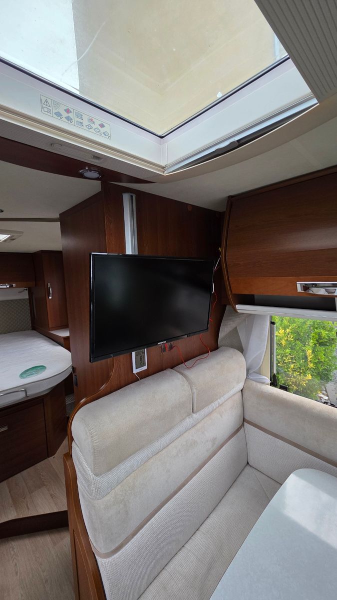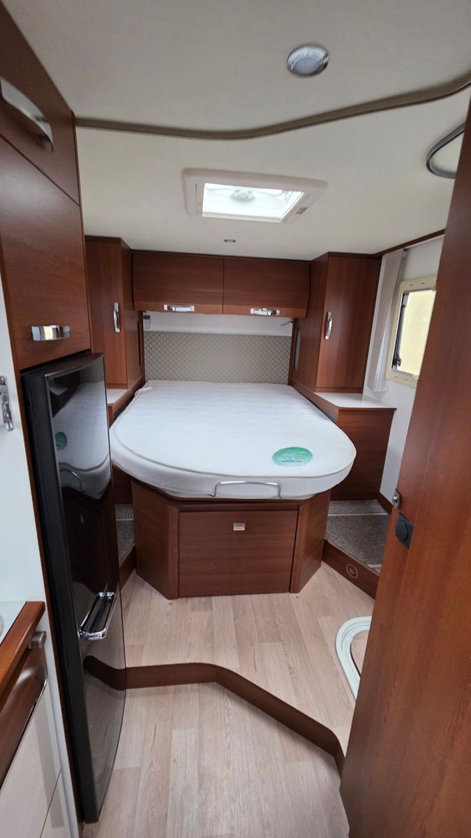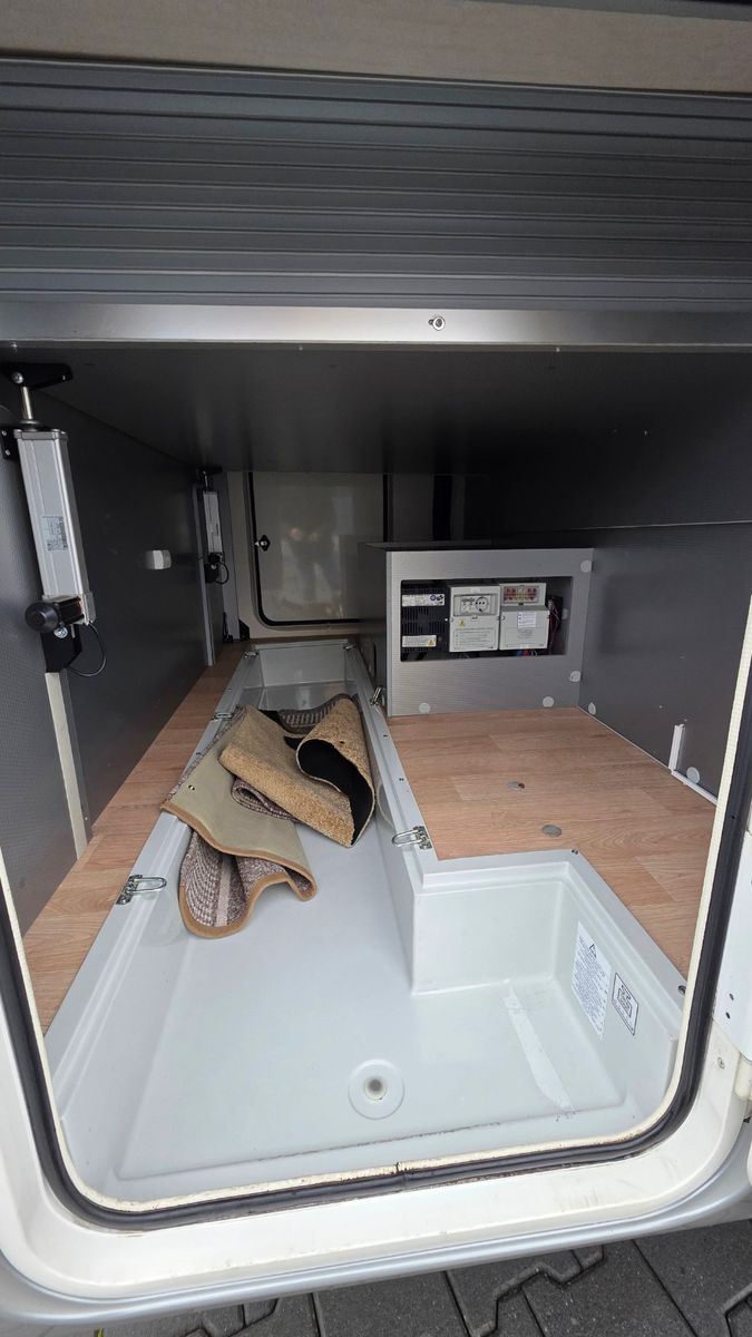 Das Fahrzeug überzeugt durch einen komfortablen Grundriss mit seitlichem, elektrisch höhenverstellbarem Queensbett, hochwertige Verarbeitung sowie einen robusten GFK-Aufbau (Dach, Wände und Boden).