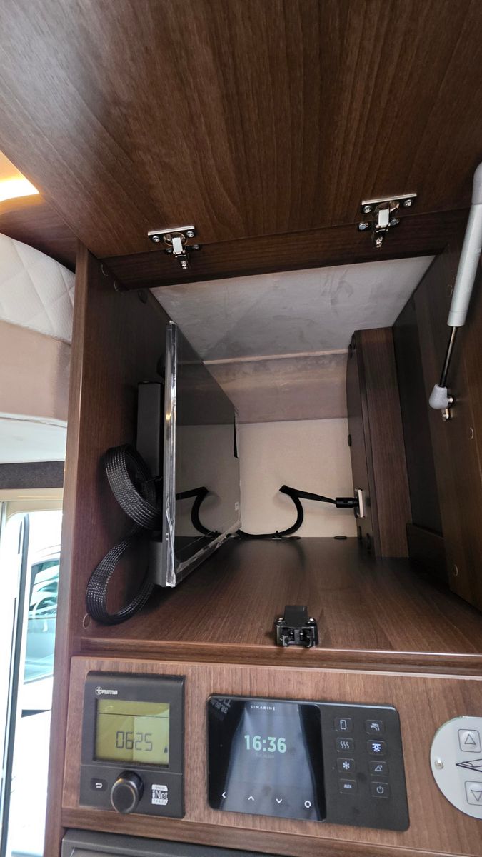 SMART TV mit Internetzugang, ausfahrbar oberhalb des Kühlschranks. Halterung